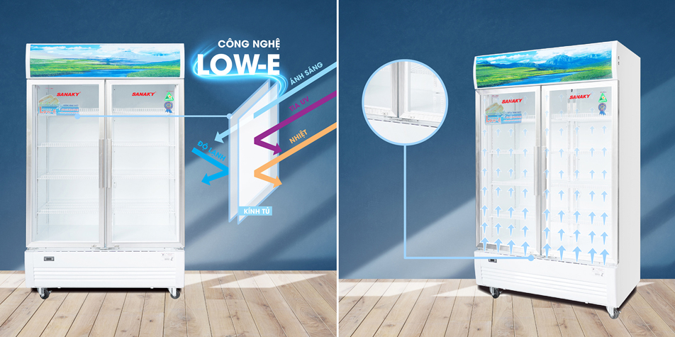 Hai cánh của tủ mát Sanaky VH-1209HP được thiết kế hoàn toàn bằng kính hai lớp chịu lực. Hệ thống sưởi kính hiện đại giúp kính không bị đọng sương, các đèn được bố trí ở nóc và thân tủ giúp khách hàng dễ dàng quan sát hàng hóa, thực phẩm được trưng bày, bảo quản trong tủ.